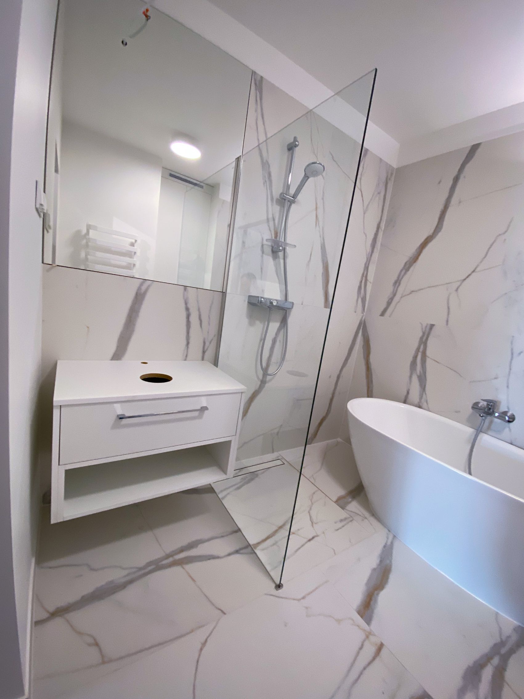Nowoczesna i elegancka zabudowa łazienkowa wykonana z Acrylux Mat Anti-Fingerprint w odcieniu 198 – „Śnieżnobiały mat”. Matowe wykończenie jest nie tylko estetyczne, ale również praktyczne – dzięki technologii Anti-Fingerprint powierzchnia jest odporna na odciski palców, co znacznie ułatwia utrzymanie czystości. Minimalistyczna forma szafki umywalkowej i dopasowanej zabudowy geberitu tworzy spójną i ponadczasową aranżację, idealną do […]